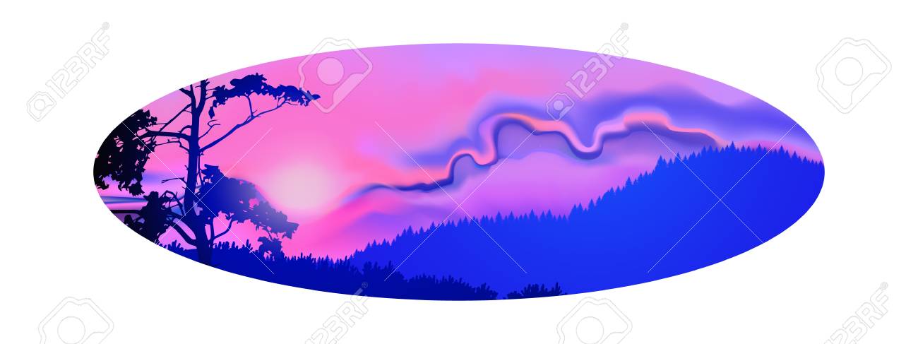 楕円形のアイコン 風景です 山と抽象的な空の背景に針葉樹のシルエット ピンクと青の色調です 日没 のイラスト素材 ベクタ Image